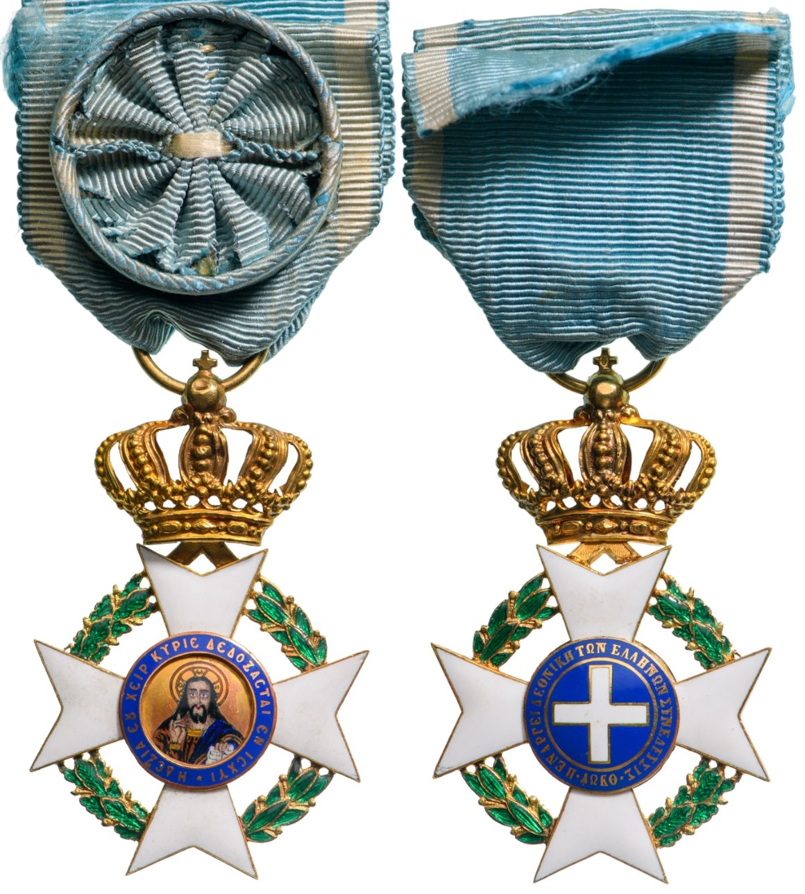 Officer's Cross, 54x34 mm, GOLD, 9.6 g., enameled, obverse centre medallion with finest enamel painting of the Christ Pantokrator, large, crown, original suspension ring and ribbon with rosette. Excellent quality and condition. I