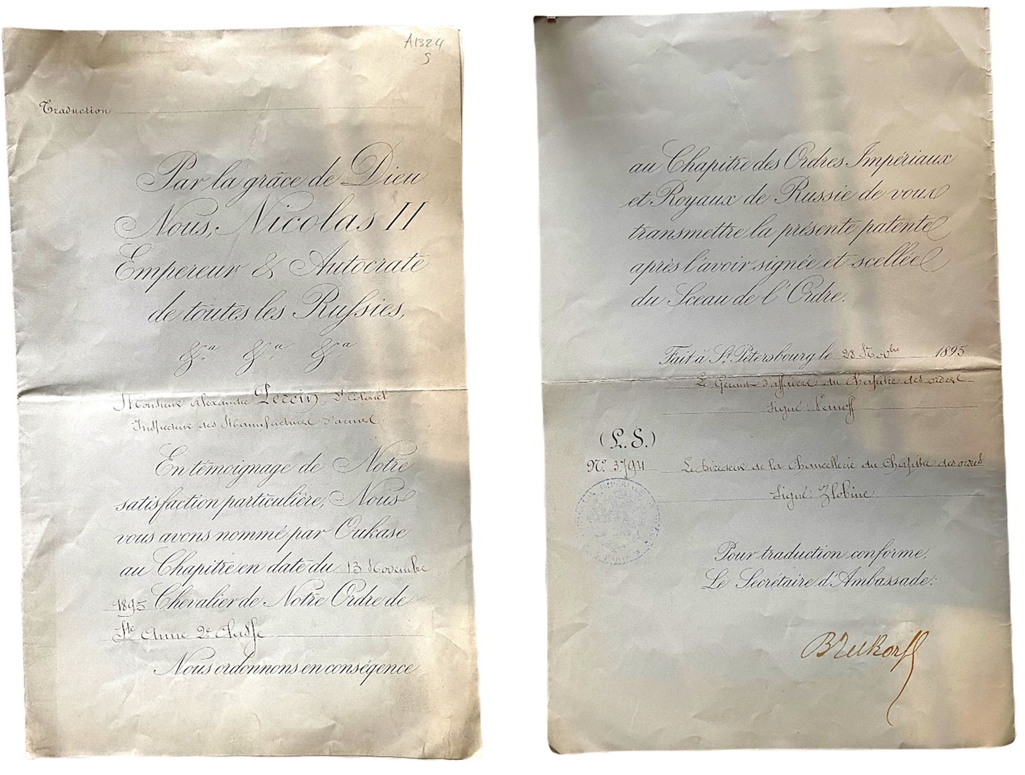 Commander`s Cross Military, 2nd Class, instituted in 1735. Neck Badge, 49x43 mm., GOLD, hallmarked "56, Kokoshnik, flower", maker's mark "AK - Anton Keibel", enameled, original suspension ring, loop and very large old ribbon, together with awarding document to a Lieutenant- Colonel, dated St. Petersburg, 13.10.1895. Superb set! I