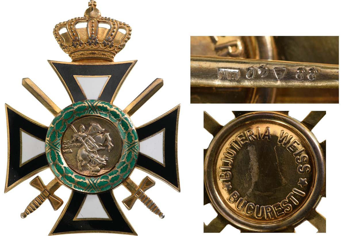 1st Class, Breast Star, 72x58 mm, gilt Silver, maker`s mark "BIJUTERIA WEISS BUCURESTI", hallmarked "88-crown-40-BW" the medallion on the obverse depicting St. George terrassing the dragon, on reverse King Carol II cipher, medium pin on reverse. Probably the rarest Romanian order in perfect condition, very seldom awarded exclusively for merits in war! I RR!