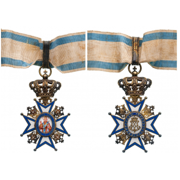 Commander's Cross, 3rd Class, 1st Model (M I monogram), instituted in 1883. Neck Badge, 83x50 mm., gilt Silver, both sides enameled, original suspension ring and long complete, ribbon. A superb rare cross, in extremely fine condition! I R!