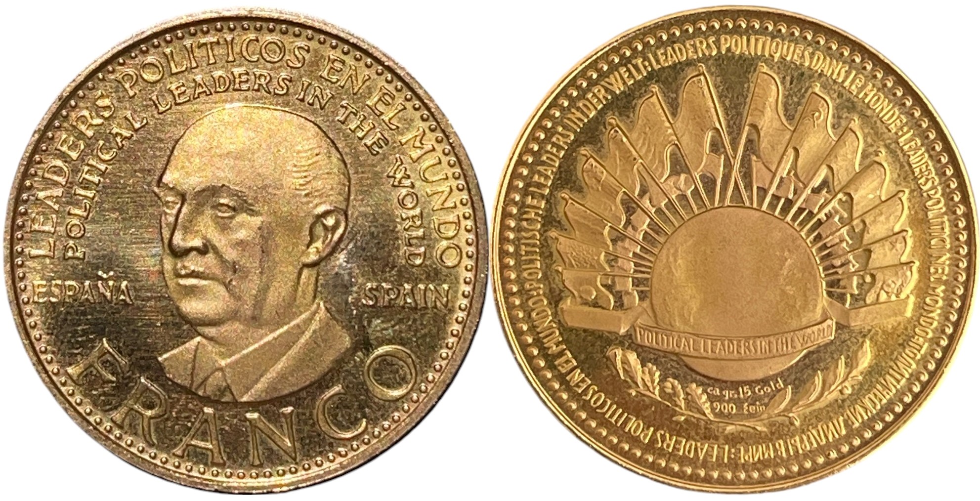 Gold, 30 mm., 15 g., The obverse with head of Franco facing left, within inscription in two lines above “LEADERS POLITICOS EN EL MUNDO” “POLITICAL LEADERS IN THE WORLD”; then at left “ESPAÑA” and “SPAIN”, and “FRANCO” below; the reverse with allegory of the world’s nations represented by flags radiating above the Earth’s globe with a scroll insribed “POLITICAL LEADERS IN THE WORLD”, a short oak and laurel wreath above which the title and weight are indicated “GR. 15 ORO LEI 900” and the initial of the artist, “NV”; around a long inscription repeating “Leaders Politicos en el Mundo” in 5 languages, including Russian.