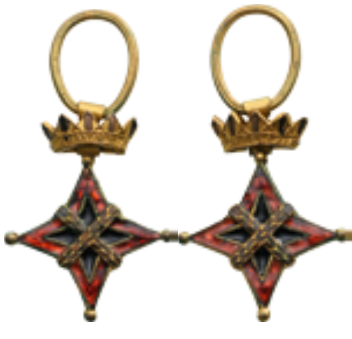 Officer’s Cross, 18 x 22,5 mm., gilt Bronze, triangular cross on both sides with black enameled centre, crossed by laurel bars and red border, ball finials, hinged, upper crown of pointed type with enameled details, the obverse base with inscriprion “CHICLANA” and to the reverse, “5 DE MARZO DE 1811”, strong loop and grooved ribbon ring and original ribbon. A very rare commemorative decoration, instituted in 1815, excellent condition. I RR!