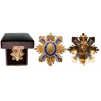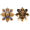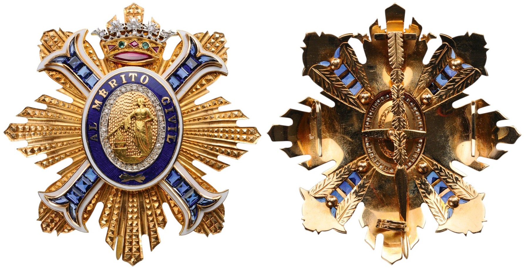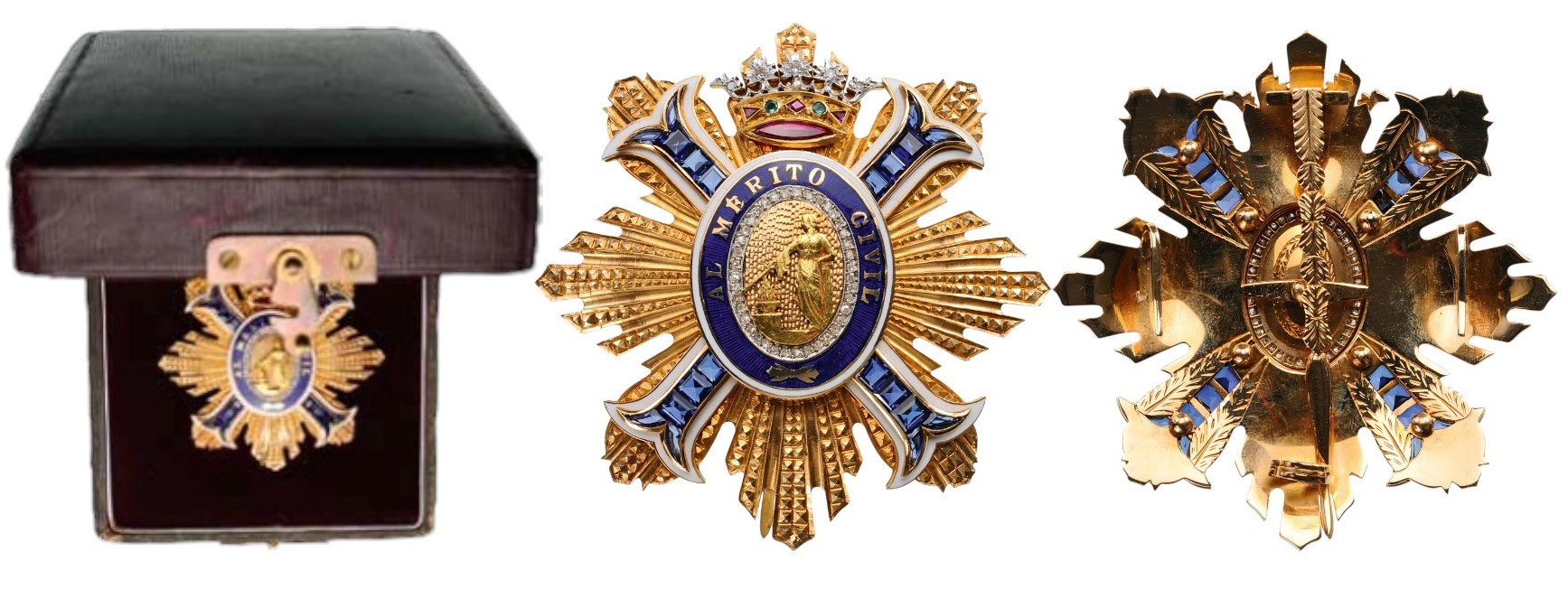 Jeweled Grand Cross Star. Breast Star 80x76 mm., with chiselled GOLD rays, white enameled cross of St. Andrew’s type with swallow’s tail finals superimposed by a similar cross in Gold, completely set with sea-blue cut stones, oval centre medallion with the golden, allegoric image of a lady pointing a sword above a fire representing the spirit of sacrifce, surrounded by a border set with tiny diamonds, the whole within blue enameled outer circlet with the Order’s motto “AL MERITO CI VIL” in golden lettering, surrounded by a thin white enameled border, above, a golden Imperial crown, also set with stones of different colours, the reverse, with engraved details, chiselled, vertical, broad pin and two side-hooks, in the original, brown morocco, fitted case of issue, with maker’s mark of "Villanueva y Laiseca, Madrid".