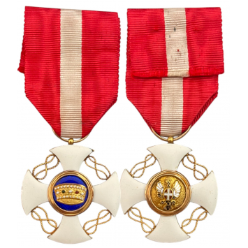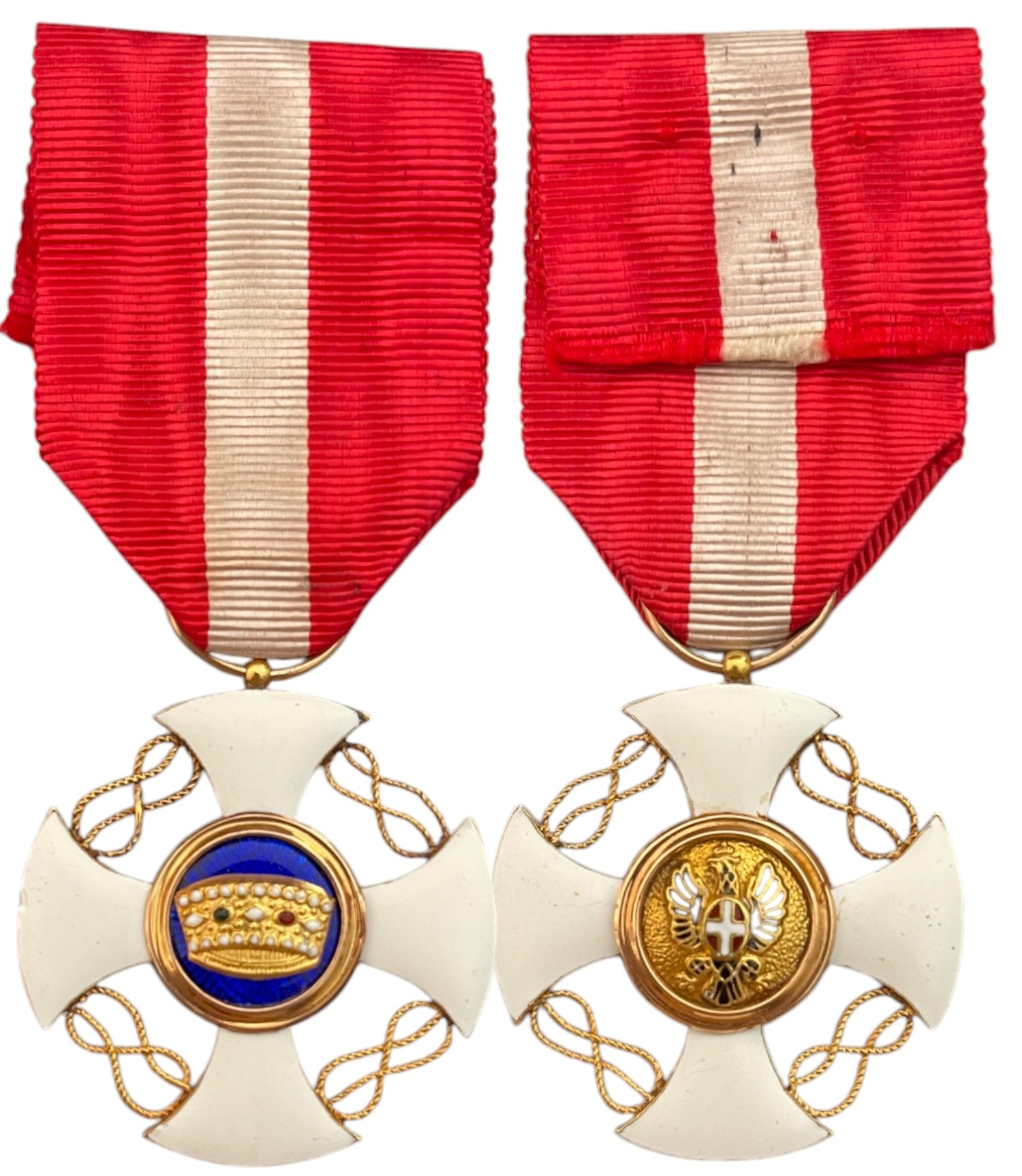 SKU: 351 Auction has finished. Total bids: 0ITALYOfficer's Cross, instituted in 1861. Breast Badge, 39x37 mm., GOLD, original suspension ring and ribbon. Mint stateI I Shop ID: HAR 62Auction LXVIII