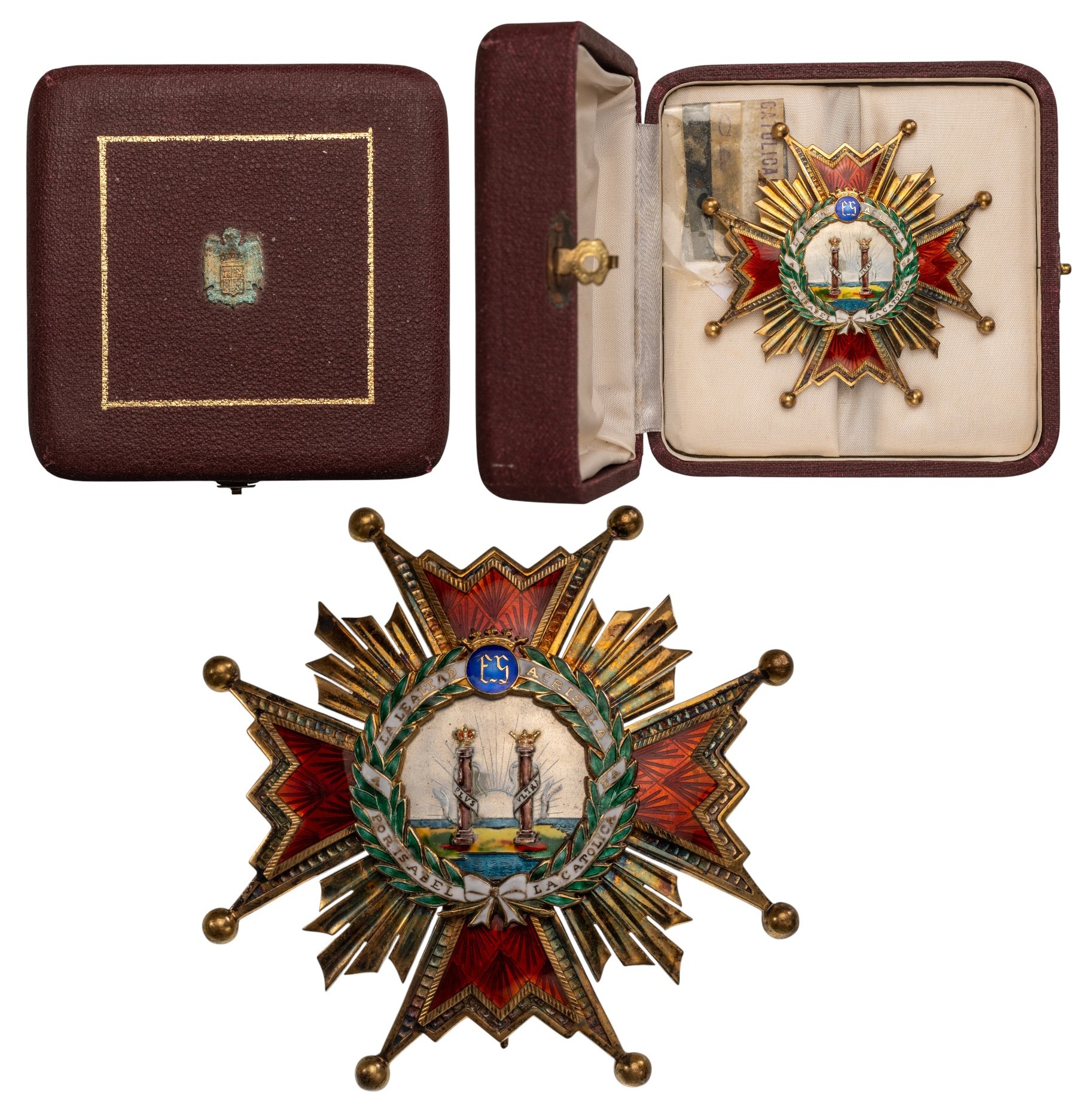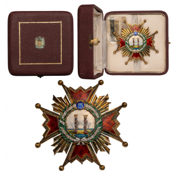 Grand Officer's Breast Star. Breast Star 77 mm, gilt Silver and separately-made, gold and red enameled arms` fields, centre medallion in the finest enamel work, framed in gold with green enameled laurel leaves and white enameled scroll with inscription, blue enameled , crowned upper escutcheon with chiseled monogram, the reverse with two side hooks and vertical pin, in original case of issue by by "Cejaloo, Madrid" with gilt coat of arms on the lid. Franco period edition. I