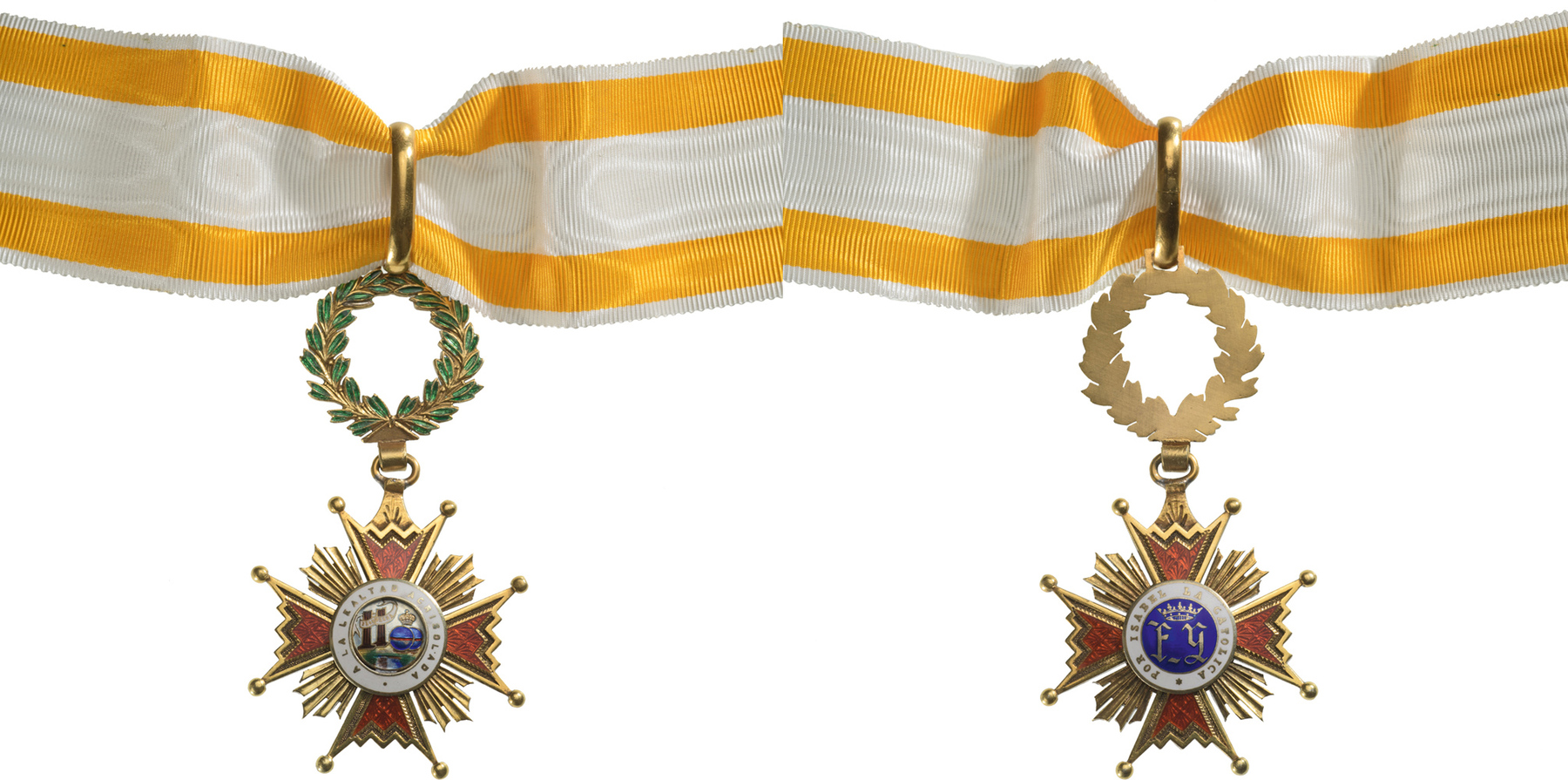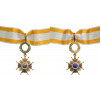 Commander`s Cross, 3rd Class, instituted in 1815. Neck Badge, 81x43 mm, GOLD, superimposed parts gold enameled, both central medallions gilt, enameled, original suspension wreath, loop and ribbon. A superb and rare order in gold, in mint state! I