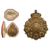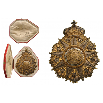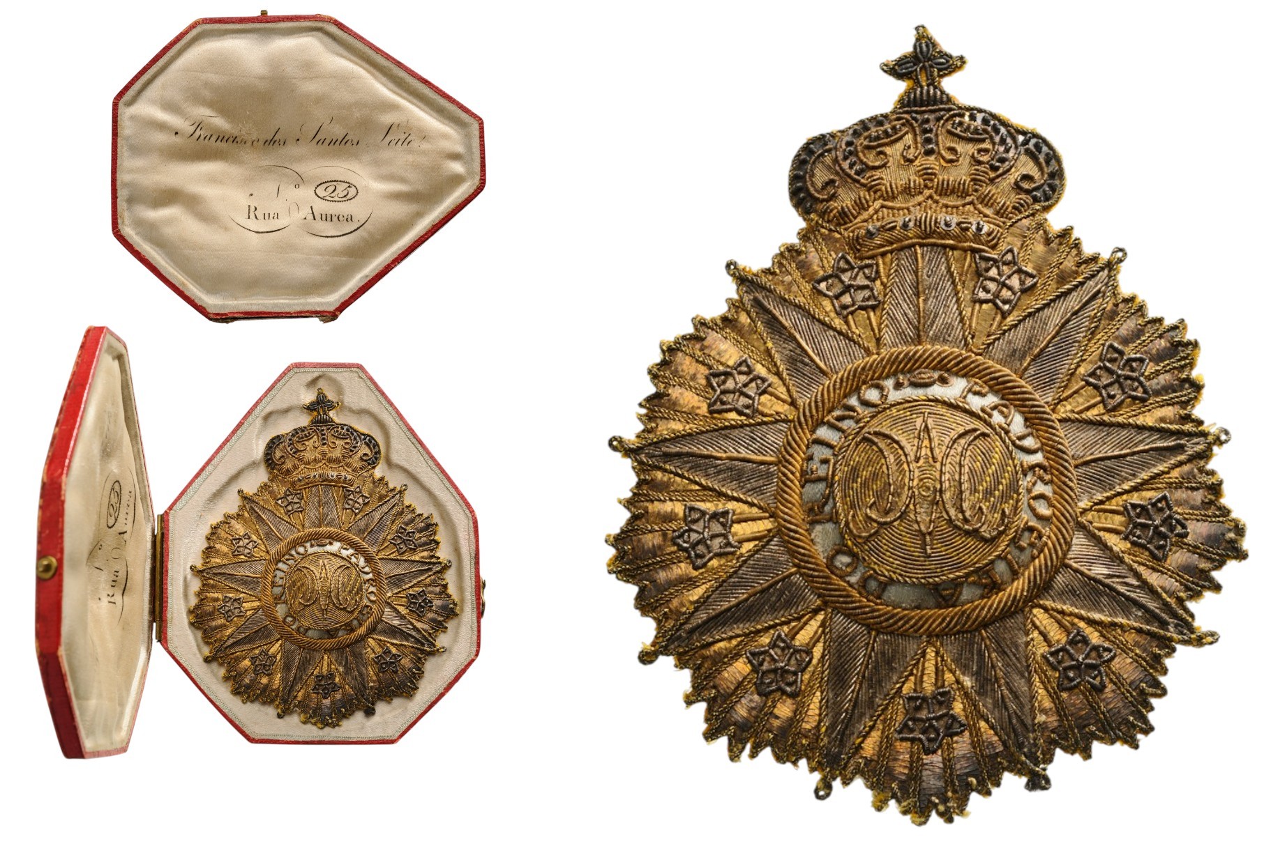 An early, embroidered Breast Star of the Order, 103x83 mm., thick, elegant and complex work of Gold and Silver wire of different types, pale blue silk-thread to the medallion’s outer circlet, tiny loops to the tips, the reverse, covered with thin, white leather, in the original, red morocco fitted case, with maker’s mark of Francisco dos Santos Leite, Lisbon. A very rare piece, of the type from the foundation of the Order in 1818; extremely fine condition, nicely toned. I RR!