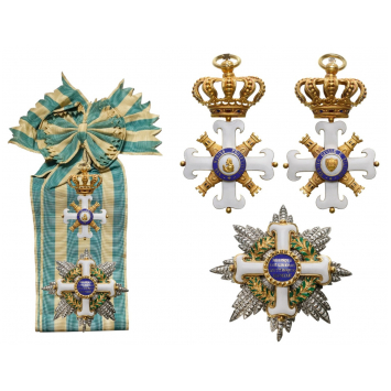 Grand Cross Set. Sash Badge, 94x53 mm., with white enameled cross with pomed endings, flanked by towers with black enameled portails and windows, white enameled centre medallion, with applied, chiseled bust of the saint, blue enameled outer circlet, bearing the inscription “SAN MARINO PROTETTORE”, white enameled centre medallion with golden coat of arms of the Republic, within blue enameled outer circlet with the inscription “MERITO CIVILE E MILITARE”, large suspension crown and round ring, original sash ribbon. Breast Star, 84 mm., with chiseled and pierced silver rays, white enameled cross in gold, similar to the badge, but flanked by green enameled oak and laurel branches, blue enameled centre medallion bearing the golden inscription “RELINQUO VOS LIBEROS AB UTROQUE HOMINE”, within golden outer circlet with chiseled as faceted, golden beads, polished reverse, with vertical pin and two side-hooks (the catch, with silver mark).