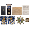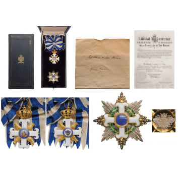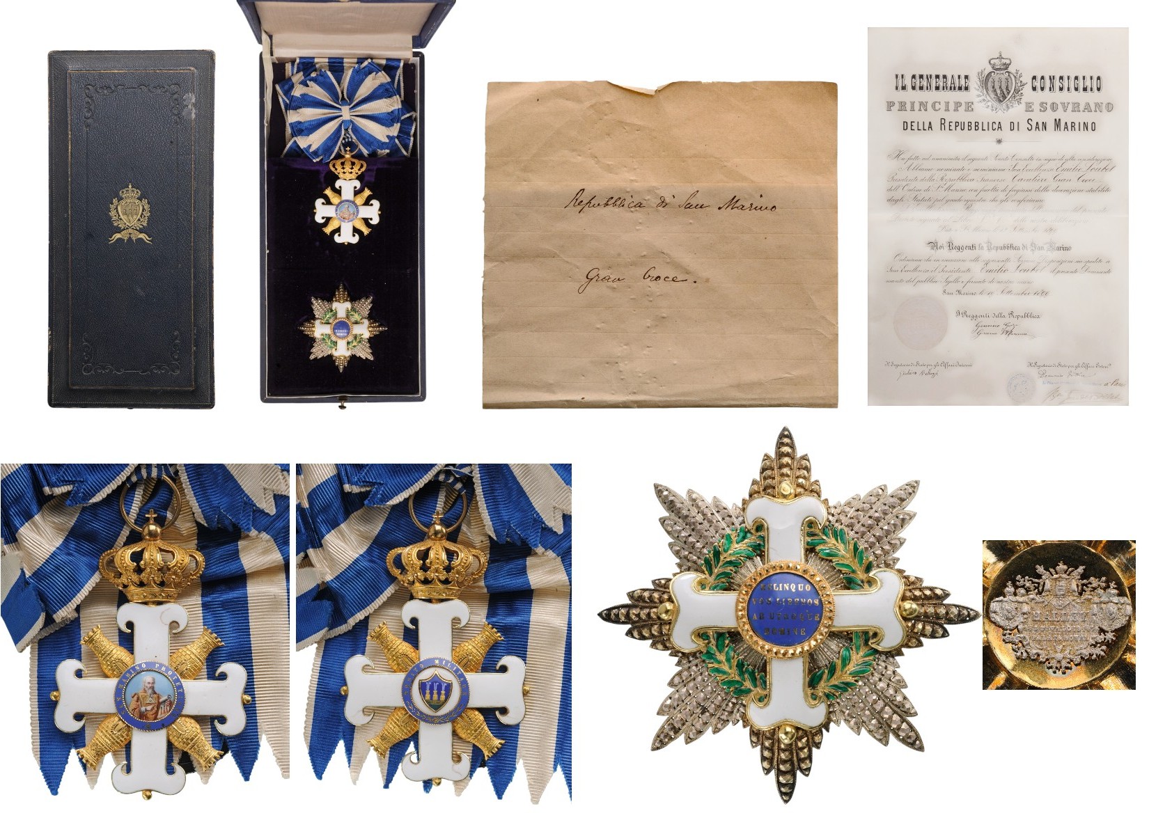 Complete Grand Cross Set. Sash Badge, 92.3x 63.3 mm., GOLD, with white enameled cross with pomed endings, flanked by towers with chiseled and engraved details, white enameled centre medallion, with image of the saint in the finest enamel miniature, blue enameled outer circlet, bearing the inscription “SAN MARINO PROTETTORE”, white enameled, reverse centre medallion with enameled coat of arms of the Republic, within blue enameled outer circlet bearing the inscription “MERITO MILITARE”, large suspension crown and round ring, original sash ribbon. Breast Star, 86.8 mm., with beautifully chiseled and pierced silver rays, white enameled cross in gold, similar to the badge, but flanked by green enameled oak and laurel branches, blue enameled centre medallion bearing the golden inscription “RELINQUO VOS LIBEROS AB UTROQUE HOMINE”, within golden outer circlet with chiseled as faceted, golden beads, gilt, polished reverse, with vertical pin and maker’s escutcheon of "Halley, Paris", in the original, night-blue morocco case, with fitted inner compartment; TOGETHER, the award document, given in San Marino, on September 19th, 1899, to Emil Loubet, President of the French Republic