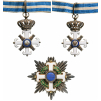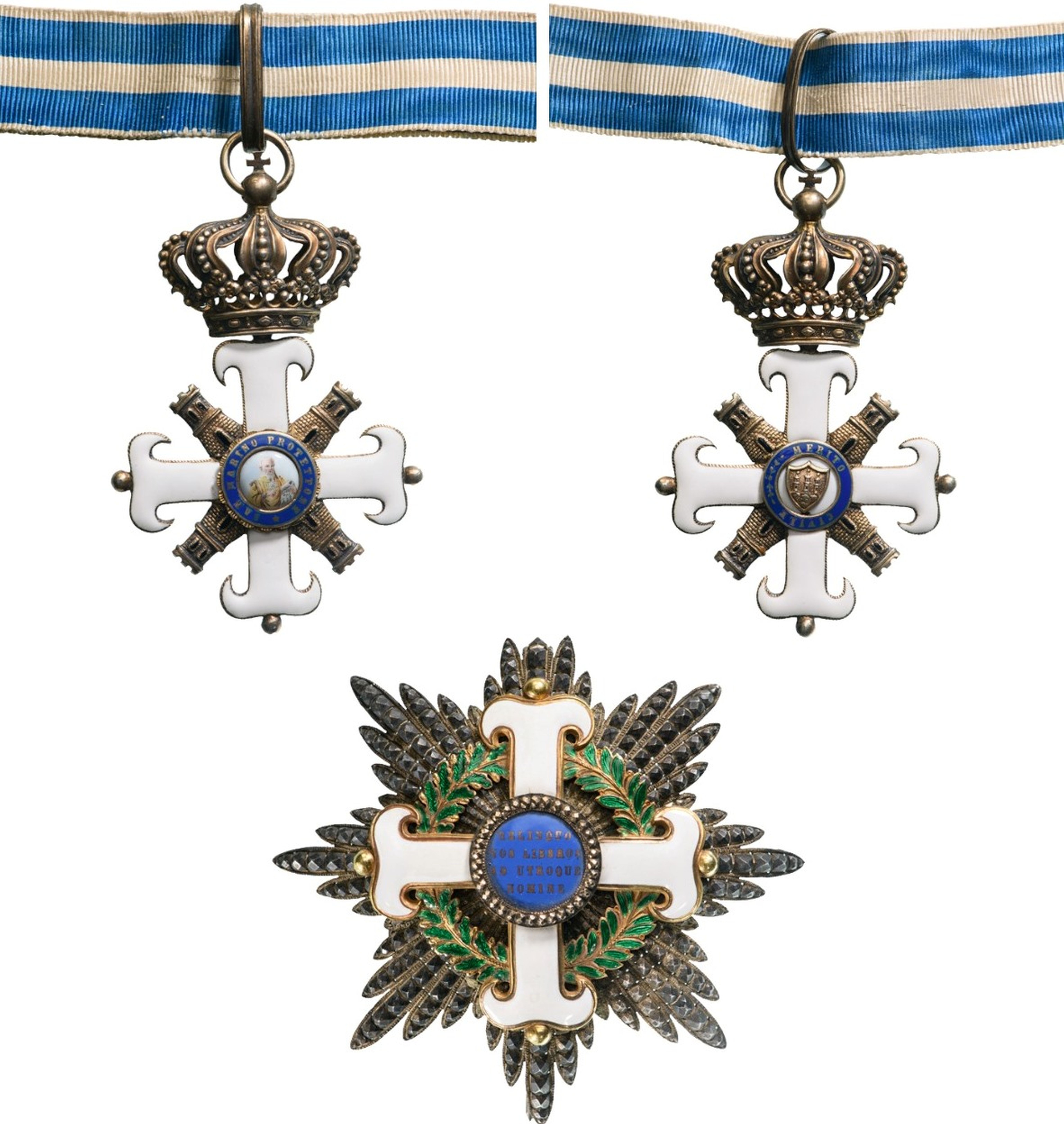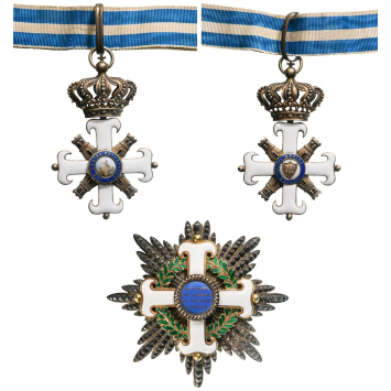 Grand Officer’s Set. Neck Badge, 85x52 mm., gilt Silver, white enameled cross with pomed endings, flanked by towers with chiseled and engraved details, white enameled centre medallion, with image of the saint in the finest enamel miniature, blue enameled outer circlet, bearing the inscription “San Marino Protettore”, white enameled, reverse centre medallion with enameled coat of arms of the Republic, within blue enameled outer circlet bearing the inscription “Merito Militarae”, large suspension crown and round ring, original ribbon. Breast Star, 90 mm., with beautifully chiseled and pierced silver rays, white enameled cross in GOLD, similar to the badge, but flanked by green enameled oak and laurel branches, blue enameled centre medallion bearing the golden inscription “Relinquo Vos Liberos Ab Utroque Homine”, within golden outer circlet with chiseled as faceted, golden beads, gilt, polished reverse, with vertical pin.