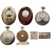 Silver case (struck with 800 silver mark and maker’s marks), 108X85 mm., the hinged rear cover with embossed horse within foliage (slightly worn), white enameled dial with inlaid ornamentations, the hours in Arabic numerals, blued hands (one, wanting), in a curious, traveling casette obverse in silver with applied shield bearing the embossed bust of Tsar Ferdinand within a wreath and above the circular window, the Tsarist crown with flying pendalia, the reverse, made of polished rootwood.