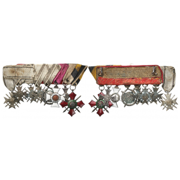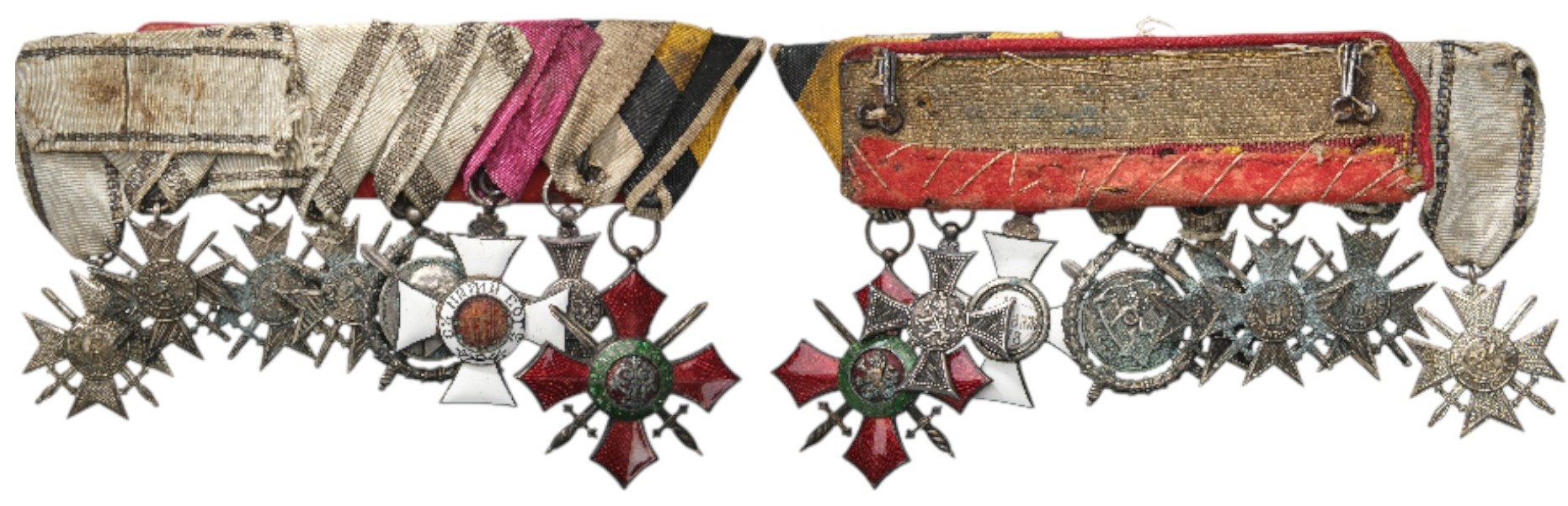 Order of Military Merit, 5th Class, Knight Cross, Silver; Cross for X Years for Officers, Silver; Order of Saint Alexander, 5th Class, Knight Cross, Silver; Order of Merit, 4th issue, Silver; 4 times Order for Bravery, Soldier's Cross (one with bow), original suspension rings and ribbons. A highly interesting group of a highly decorated officer! II- R!
