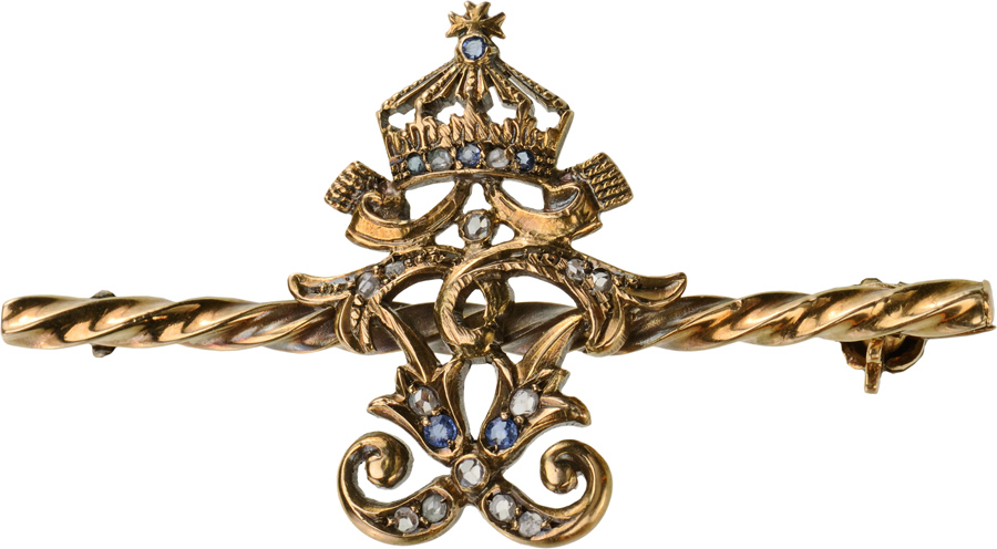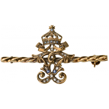 Breast Badge, 21,4 x 12 mm., GOLD, “mirror”-type, latin, crowned cypher of Tsar Ferdinand, set with Diamonds, mounted on a horizontal, twisted, golden bar of square section, the reverse fitted with thin, round pin with safety catch.