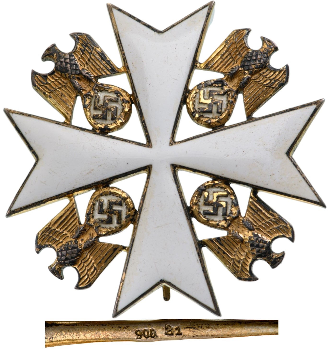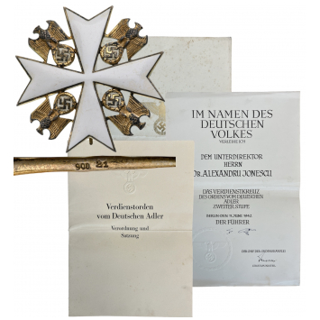 Officer's Cross, 4th Class, instituted in 1943. Breast Star, 50 mm, gilt Silver, hallmarked "900 - 21", one-side enameled, original pin on reverse, together with awarding document and statutes, named to a Romanian citizen, dated 11th of june 1942. A superb and very rare set in extremely fine condition, intact silver gilding! I RR!