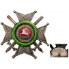 Commander’s Breast Star with Swords, 80 mm, Silver, chiselled and pierced arms with Golden swords between them, centre medallion with white enameled “running horse” on a bright red enamel ground with green enameled “field” below, pale blue enameled outer circlet with motto “NEC ASPERA TERRENT” in separately applied, finely chiselled gold lettering, within a thick, green enameled laurel wreath with orange-red berries, the reverse with centre disc, bearing the engraved maker’s mark “RUNDELL BRIDGE & RUNDELL. JEWELLERS TO THEIR MAJESTIES His Royal Highness the PRINCE REGENT AND THE ROYAL FAMILY.” vertical, broad golden pin. An early, very rare and fine star, from ca. 1830 in very fine condition.
