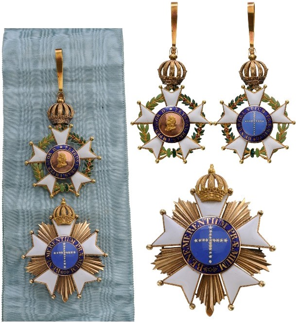 Grand Cross Set. Sash Badge, 90 mm., GOLD, 65.16 g., white enameled 5-armed gold cross with ball-finials, flanked by light green enameled olive and dark green enameled laurel wreath, centre medallion in gold with the embossed bust in uniform of the Emperor Pedro I in uniform on polished ground; dark-blue enameled outer circlet with golden inscription “PETRUS I BRAS. IMPERATOR D.”, sky-blue enameled reverse centre medallion, with a cross of white enameled, tiny five-pointed stars, dark blue enameled outer circlet with golden inscription “BENEMERENTIUM PRÆMIUM” and a rosette below, the upper arm, with hinged, Brazilian Imperial crown in gold with chiseled details, “stirrup” link-ring soldered to the tapering, polished suspension ring and a length of the original, silk, sash ribbon. Breast Star, 80x65 mm., GOLD, 59 g., with five, gold-bordered, white enameled arms flanked by polished, golden beams; sky-blue enameled centre medallion, with a cross of silver, tiny five-pointed stars, dark blue enameled outer circlet with golden inscription “BENEMERENTIUM PRÆMIUM” and a rosette with stylized leaves below, the upper arm with superimposed, Brazilian Imperial crown with engraved and chiseled details, the reverse, fitted with vertical pin.