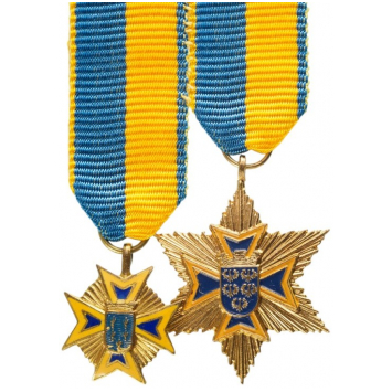 Grand Cross Set Miniatures. Breast Badge, 18x15 mm, gilt Bronze, one side enameled, original suspension ring and ribbon. Breast Star, 23 mm, gilt Bronze, superimposed part enameled, original suspension ring and ribbon. A beautiful rare set, in very fine condition! I R!
