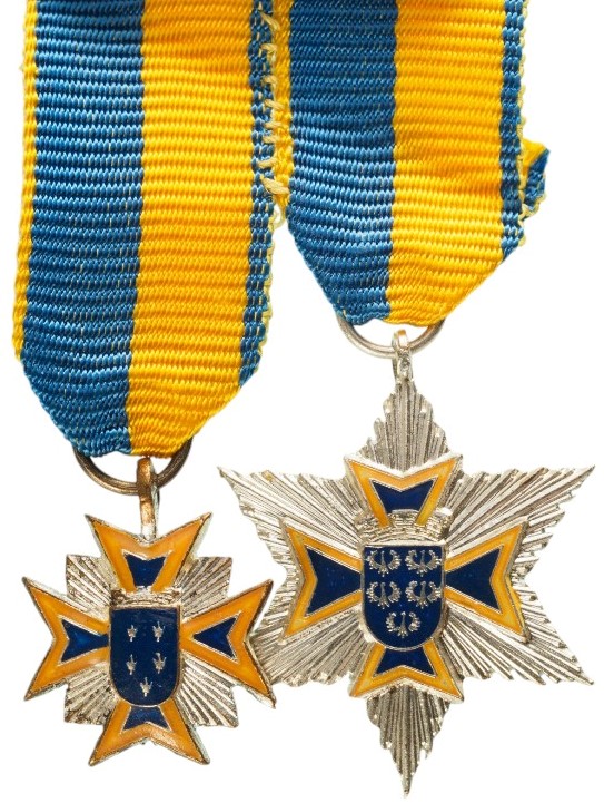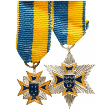 Grand Officer's Set Miniatures. Breast Badge, 18x15 mm, gilt and silvered Bronze, one side enameled, original suspension ring and ribbon. Breast Star, 25 mm, silvered and gilt Bronze, superimposed part enameled, original suspension ring and ribbon. A beautiful rare set, in very fine condition! I R!