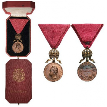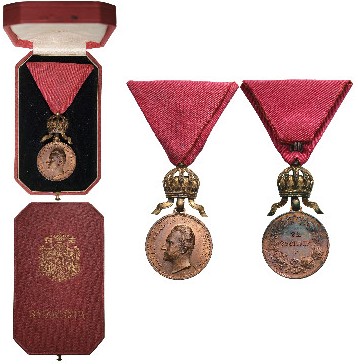 3rd Class 4th Type, 1st Model of crown. Breast Badge, 52x28 mm, Bronze, original suspension ring and triangular ribbon, in case of issue by "Rothe, Wien", with gilt weapon and inscription on the lid. A superb Austrian made badge, in mint condition! I R!