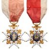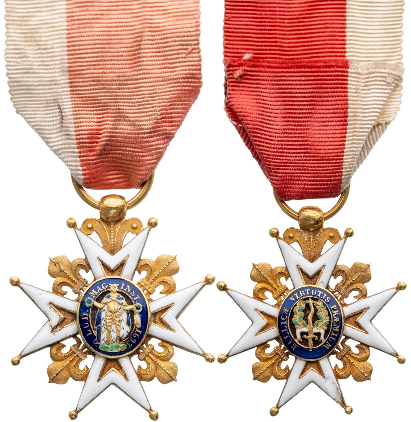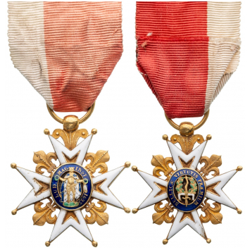 Knight's Cross, Louis Philippe I (1830-1848) Type, 3rd Class slightly reduced size, instituted in 1693. Breast Badge, 33x29 mm, GOLD, 7 g., enameled, both central medallions gold, enameled, original suspension ring and ribbon for the order of the Lys and Legion of Honor. A superb badge of high jeweller's quality and great condition! I-