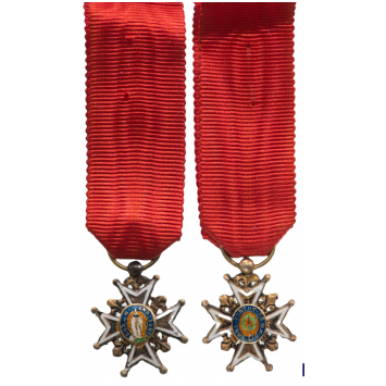 Knight's Cross Miniature, Louis Philippe I (1830-1848) Type, 3rd Class, instituted in 1693. Breast Badge, 16x13 mm, GOLD, 1.2 g., enameled, both central medallions Gold, enameled, original suspension ring and ribbon. Rare and very attractive! I- R!
