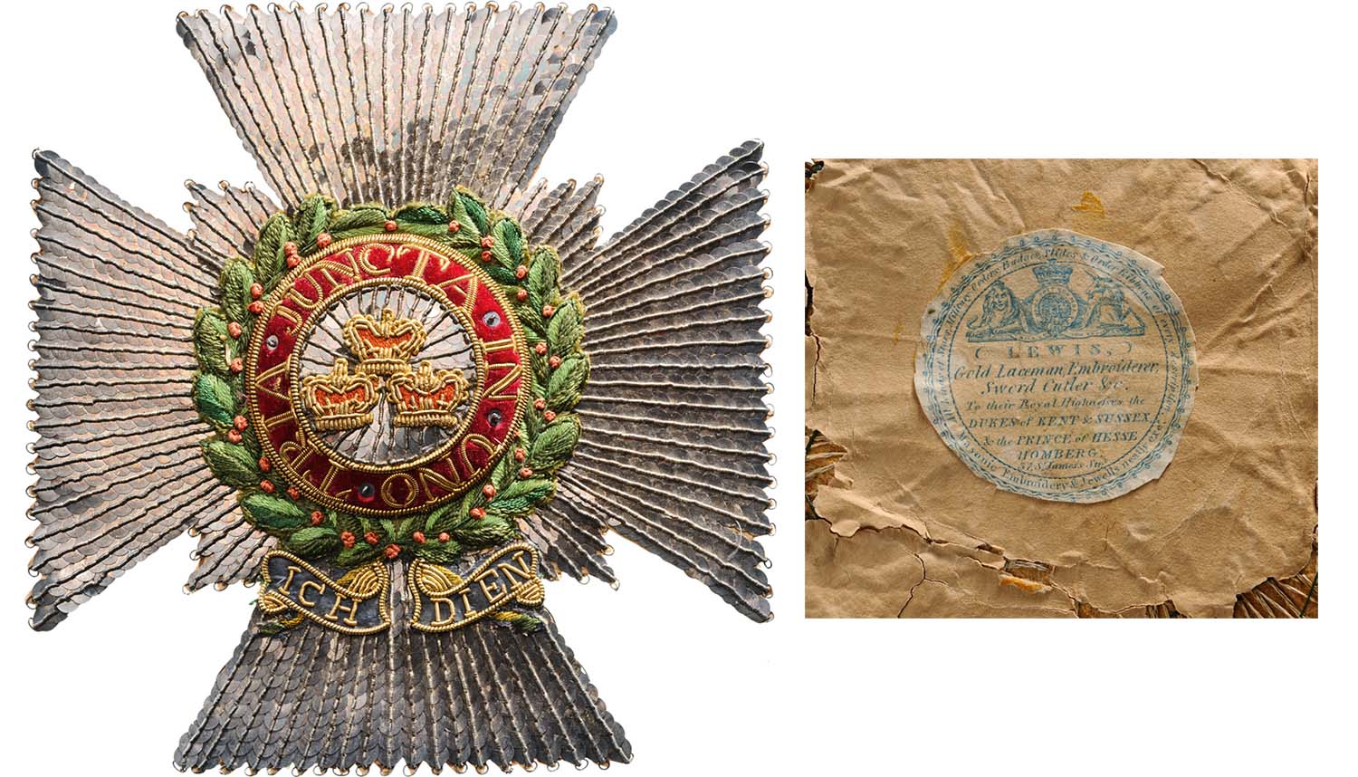 An embroidered, mantle Star to a Commander of the Military Division, 165 mm, the arms, with sequined embroidery, polychrome embroidered centre with details in gold wires and thick, deep red velvet, the reverse backed with thin paper (minor loss and tears), the centre with circular maker`s label of "Lewis Gold Laceman, Embroiderer, Sword Cutler &c. to their Highnesses the Dukes of Kent & Sussex & the Prince of Hesse Homberg, 37. St. James Str.".An imposing, early, beautiful piece, in the finest quality, very fine condition and patina.The Order of the Bath, founded in 1725 by the King George I, derives its curious name in the homage to the ancient ceremony for creating a Knight which involved a symbolic bath as a sign of personal and spiritual purification. It rewarded any kind of merit, civil and military towards the Crown, in 1815, it was divided into two distinguished Divisions, Civil and Military. II R!