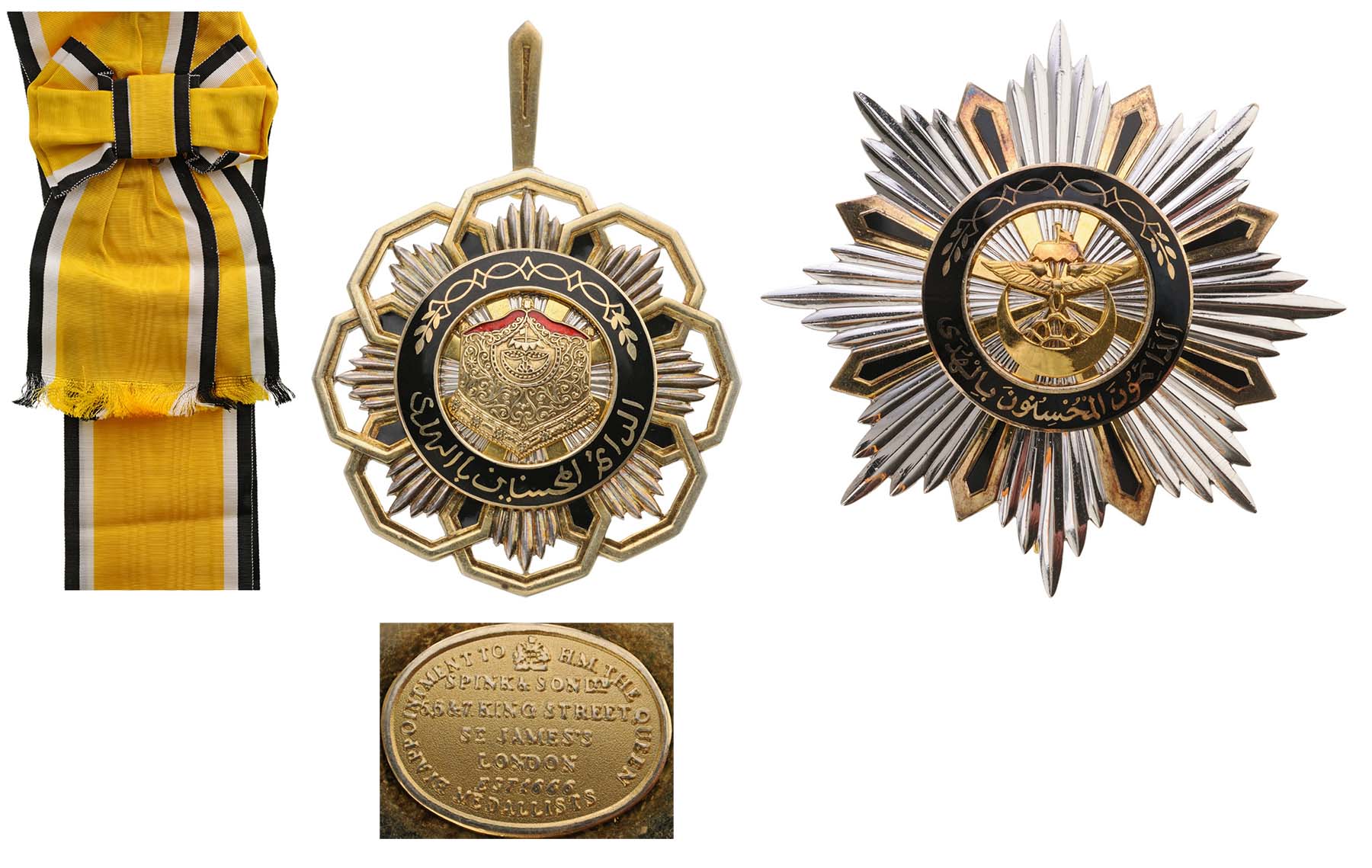 Grand Cross Set, 1st Class, instituted in 1954. Sash Badge, 59 mm, gilt Silver, maker`s mark "Spink&Son, London", one side enameled, central medallion gilt silver, original suspension loop, long complete sash. Breast Star, 89 mm, gilt Silver, enameled, central medallion gilt silver, enameled, reverse with tapered vertical pin. A superb and very rare set, in mint condition! I RR!