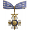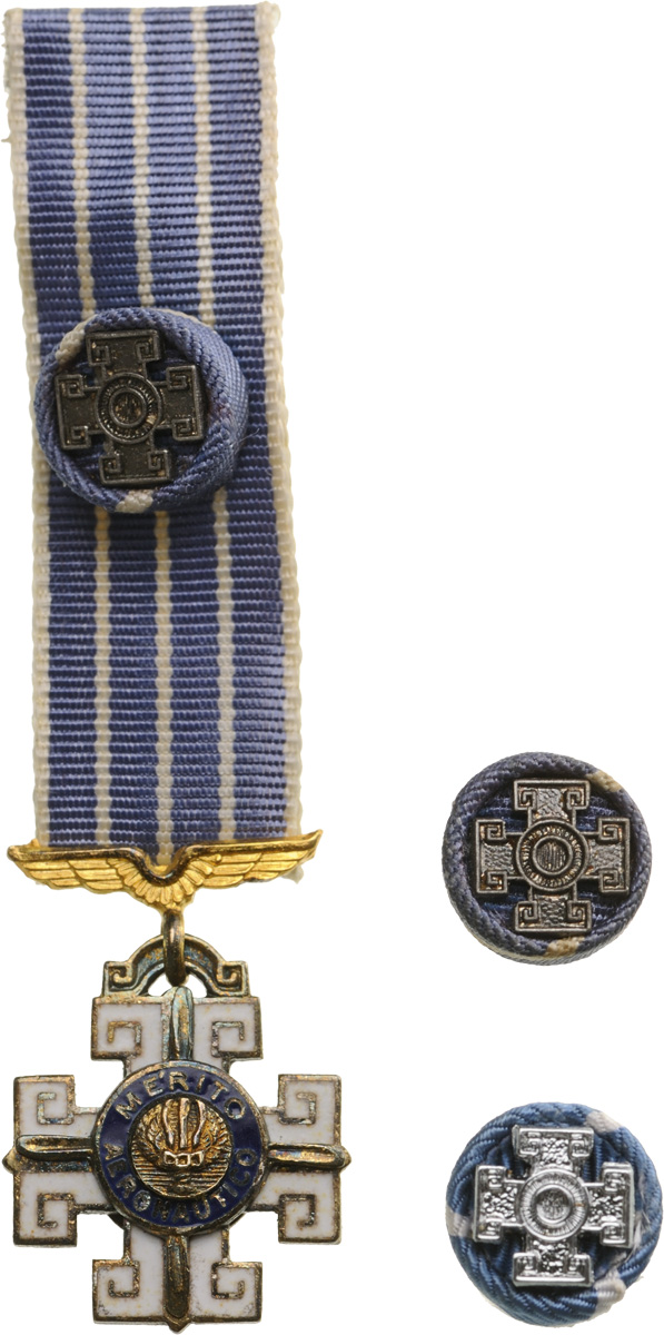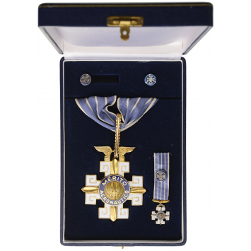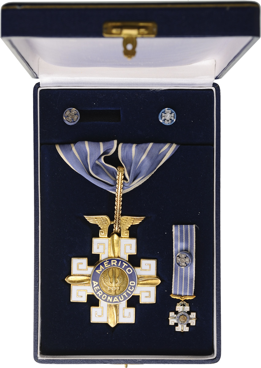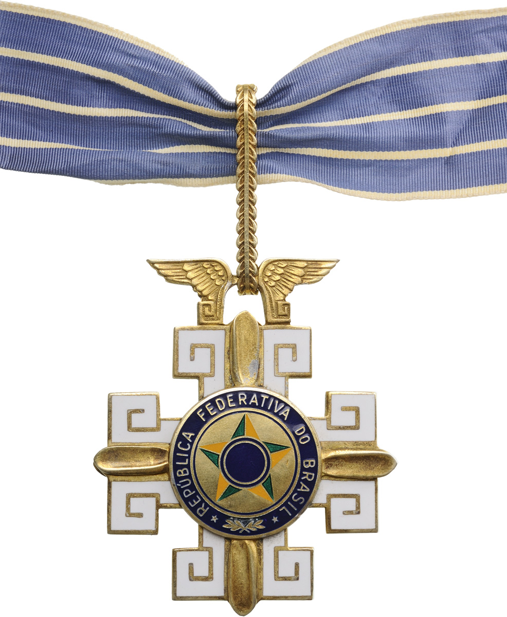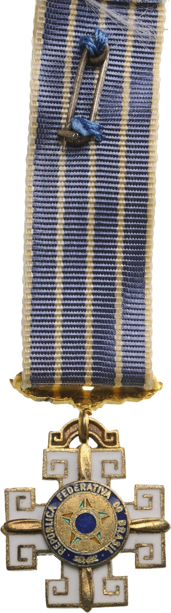 Commander's Cross, 3rd Class, instituted in 1943. Neck Badge, 65x62 mm, gilt Silver, both sides enameled, both central medallions gilt Silver, enameled, original suspension loop and neck ribbon, together with miniature in Silver, enameled and two lapel hole rosette, in original case of issue by "Esmaltarte - Brasil" with gilt weapon on the lid. Rare and in mint condition! I R!