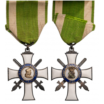 Knight's Cross, 2nd Class with Swords, 2nd Type, instituted in 1850. Breast Badge, 45x34 mm, partially gilt Silver, both sides enameled, both central medallions gilt, enameled, original suspension ring and ribbon. A superb cross in extremely fine condition! I
