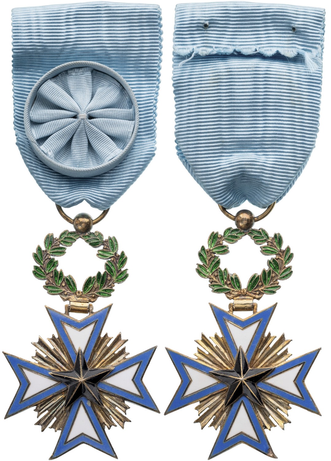 SKU: 92 The Live Auction begins in: Click here to register for the live Auction Starting price 70 EUR Log in to place a bid. Total bids: 0BENINOfficer's Cross, instituted in 1889. Breast Badge, 60x37 mm,, gilt Silver, both sides enameled, original suspension ring and ribbon with rosette. Almost extremely fine condition! I- Shop ID: 69,383Auction LXX - Day 1