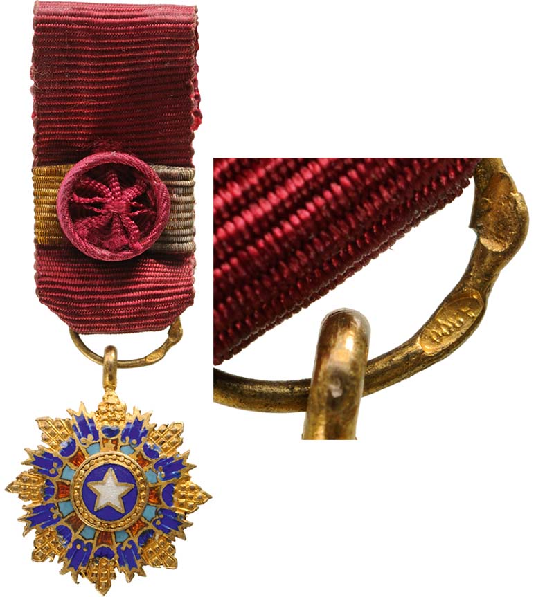 Miniature of the Grand Officer`s Badge, 16 mm, in gilt Silver and enamels; the suspension ring, struck with "900" mark and a further, French one; original ribbon, with rosette on gold/silver woven bar. A rare miniature, excellent condition and quality. I R!