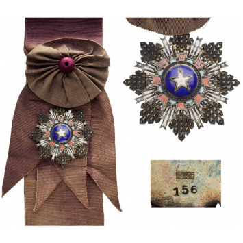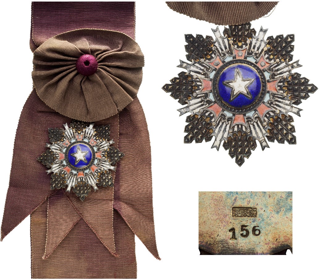 SKU: 430 The Live Auction begins in: Click here to register for the live Auction Starting price 750 EUR Log in to place a bid. Total bids: 0CHINA1st Class Badge, instituted in 1941. Sash Badge, 75 mm, partially gilt Silver, one side enameled, numbered "156", original suspension ring and sash. Superb and rare badge! I R! Shop ID: SPINK 9Auction LXX - Day 1