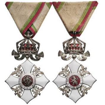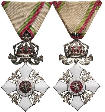 Knight's Cross with crown, 5th Class, 3rd Pattern, 1937, with flat reverse. Breast Badge, 77x48 mm, silvered, central medallion enameled, original suspension ring and triangular ribbon. A scarce badge of best quality, and very fine condition! II