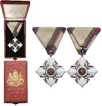 Knight's Cross, 5th Class, 2nd Pattern, 1910. Breast Badge, 50x47 mm, Silver, central medallion enameled, original suspension ring and triangular ribbon, in case of issue by "Johann Schwerdtner - Wien", with gilt weapon and inscription on the lid . A splendid badge of best Austrian quality, in mint condition! I I