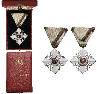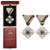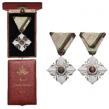 Knight's Cross, 5th Class, 2nd Pattern, 1910. Breast Badge, 54x51 mm, silvered, central medallion enameled, original suspension ring and triangular ribbon, in case of issue, with gilt crown and inscription on the lid . A beautiful badge, in mint condition! I I