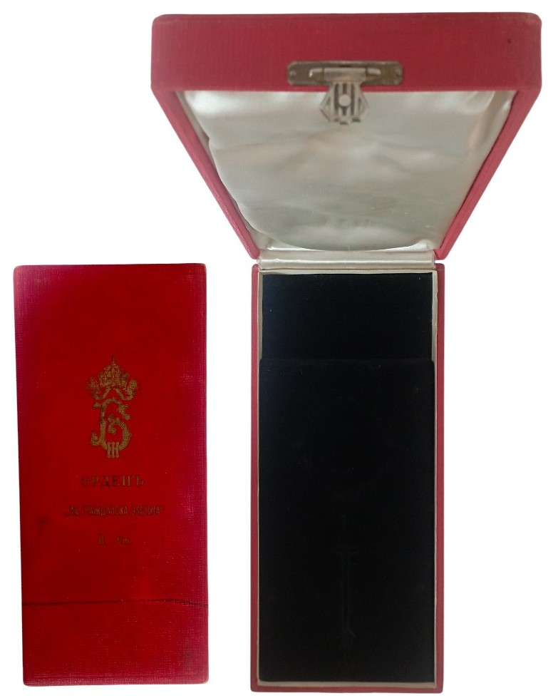 SKU: 214 The Live Auction begins in: Click here to register for the live Auction Starting price 400 EUR Log in to place a bid. Total bids: 0BULGARIAGrand Officer's Set, 2nd Class, Case of Issue, 3rd Model. Original Case of Issue, with gilt monogram of Tsar Boris III and inscription on the lid. A box in almost extremely fine condition! I- Shop ID: 69,304Auction LXX - Day 1