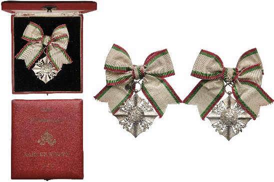 3rd Class Cross for Ladies. Breast Badge, 50x46 mm, silvered, original suspension ring and ribbon with bow, in case of issue, with gilt crown and inscription on the lid. A superb badge, in mint condition! I