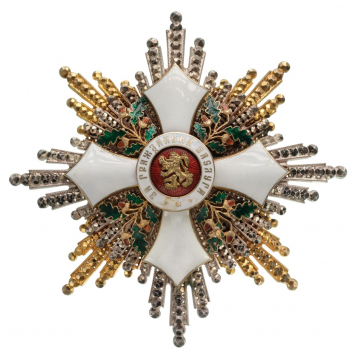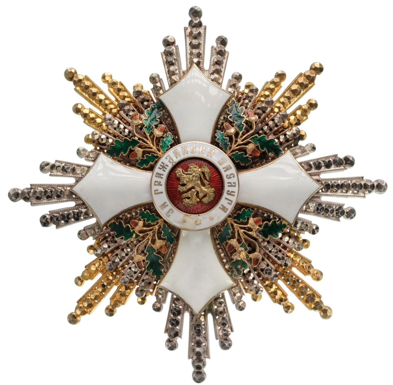 Grand Cross Star Republic Model, 1944-1950. Breast Star, 94 mm., superimposed, brilliant-cut and pierced gilt-silver and silver rays, the centre with white enamelled pointed cross and green enamelled oak leaves between the arms, obverse centre medallion with Bulgarian lion on red enameled ground, within white enamelled outer circlet with the cyrillic motto “FOR CIVIL MERIT” in gold lettering, “frosted” and polished reverse with four nuts retaining the elements of the obverse; polished centre disc broad pin. An excessively rare star, in best quality and condition! I RR!