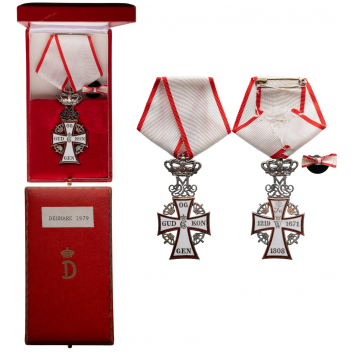 Knight's Cross, instituted in 1671. Breast Badge, 60x29 mm., Silver, both-sides enameled, original suspension ring and ribbon, in case of issue by "A. Michelsen - Kobenhavn", with lapel hole rosette. A beautiful and elegant cross, awarded to an British Official, in mint condition!