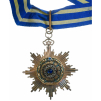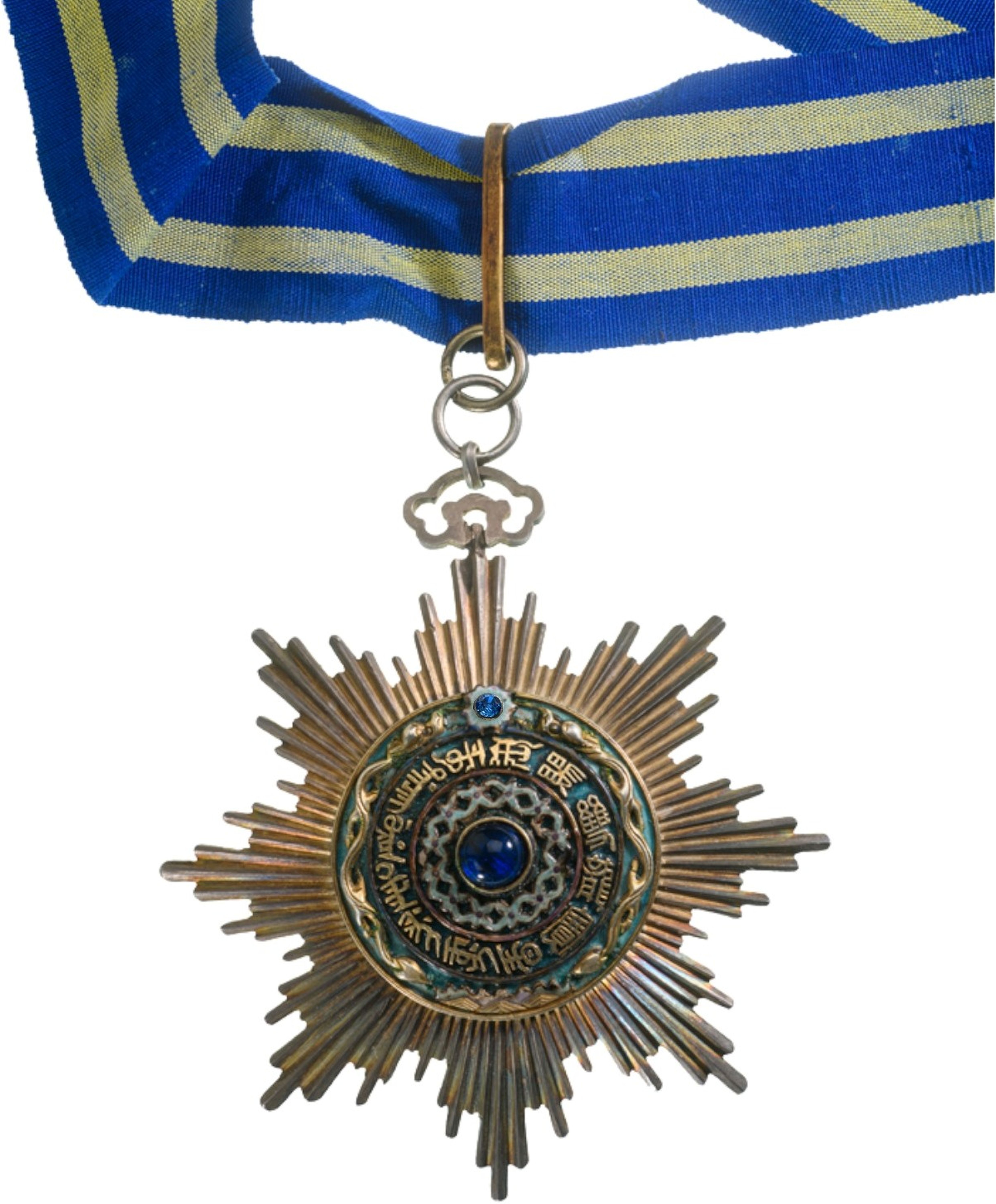3rd Class, 1st Grade, 2nd Type Badge of the Order in Silver, 98x90 mm, with smooth, pointed rays, the centre set with a translucent, blue cabochon, within raised inscriptions, pale blue enameled details, stylized dragons, facing a small cabochon of red coral, ornamented suspension and two rings, with original neck ribbon with adjusting and closing device. An extremely rare, special model of very large dimension, excellent condition. I RR!