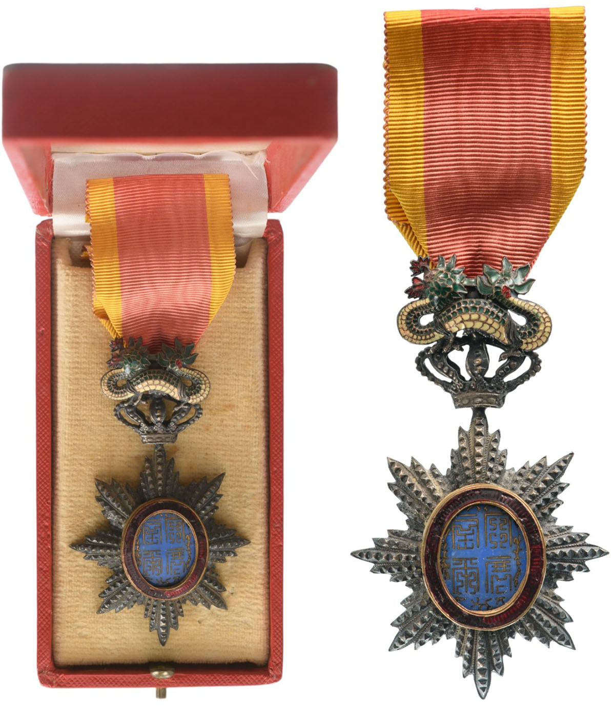 Knight's Cross, 5th Class, instituted in 1886. Breast Badge, 83x49 mm., Silver, brilliant cut rays, central medallion enameled, original suspension device, ring and ribbon, in case of issue. A very fine badge, in extremely fine conditionI