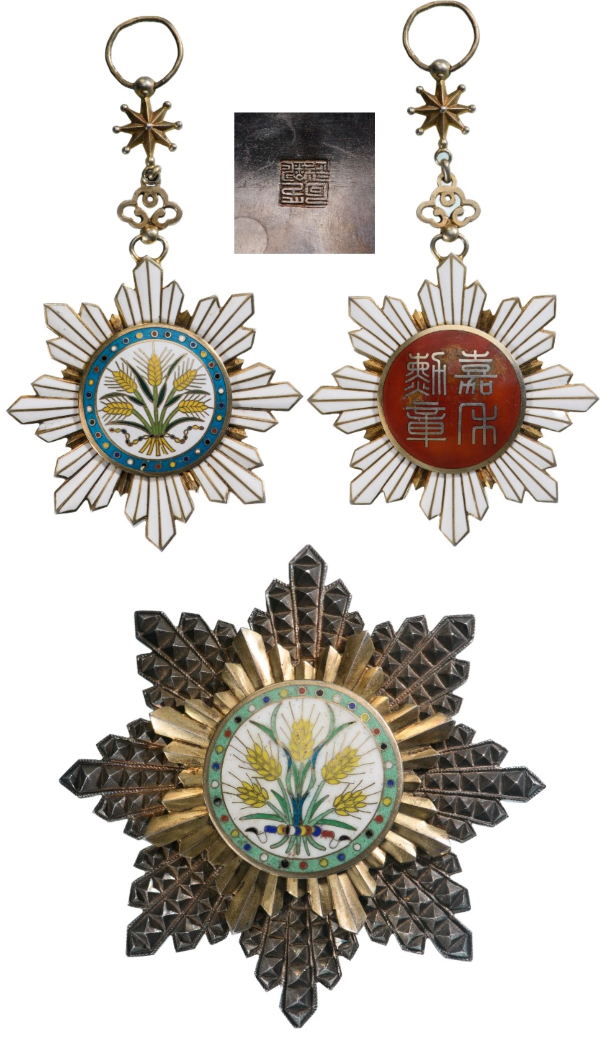 Grand Cross Set. Sash Badge, 120x66 mm., gilt Silver and white enamel, centre medallion with polychrome cloisonne enamel work, reverse medallion with trans- lucent, red enamel and golden, Chinese inscription, ornamented suspension.