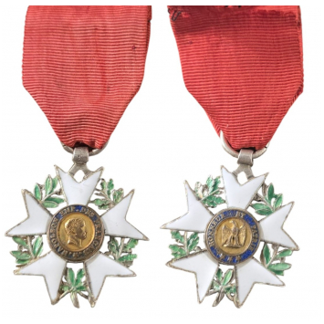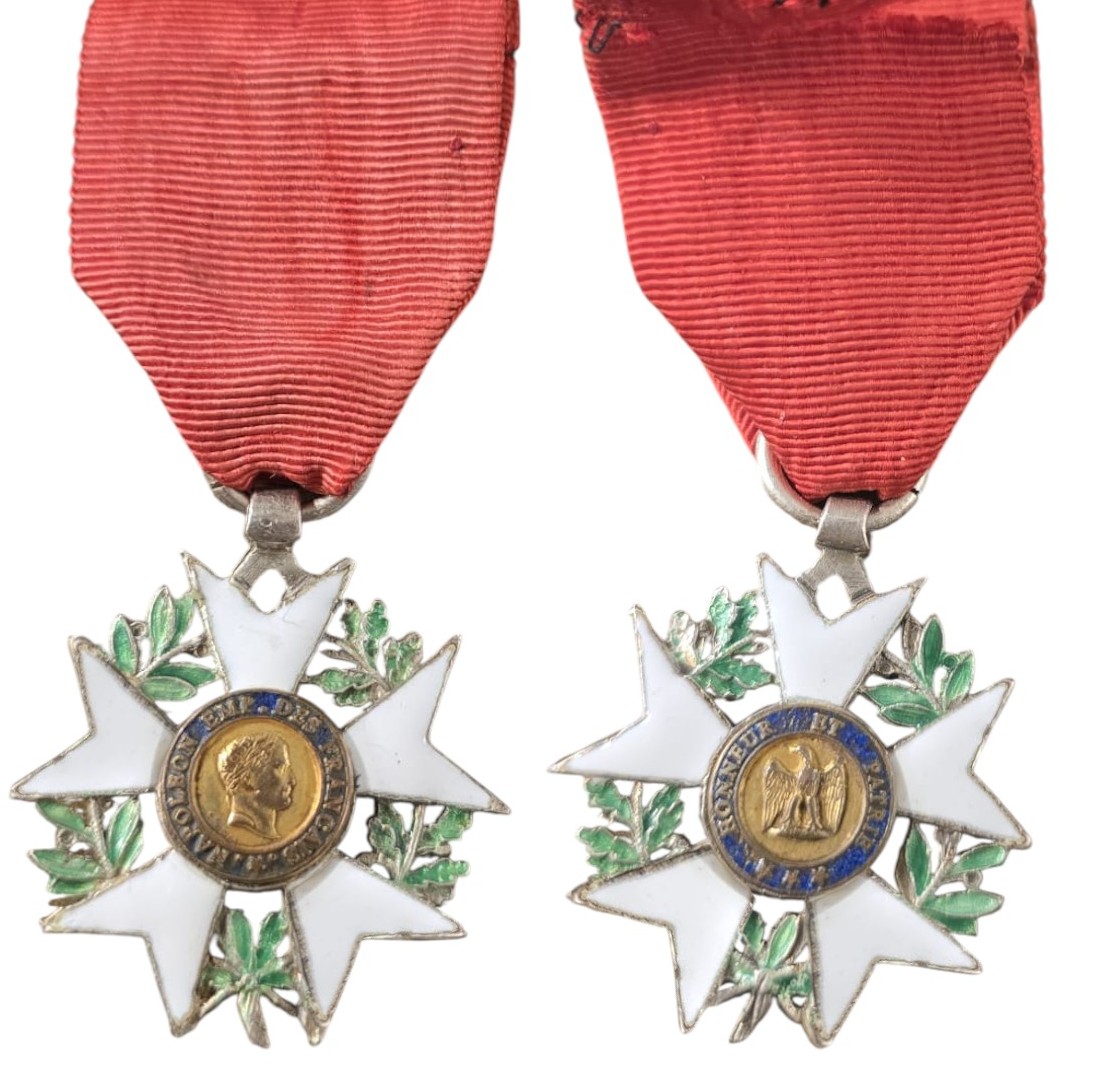 Knight's Cross, 1st Empire, 1st Type, instituted in 1802. Breast Badge, 42x38 mm, Silver, enameled, GOLD centers, original suspension ring and ribbon. A hybrid model, in extremely fine condition! II