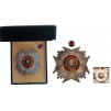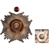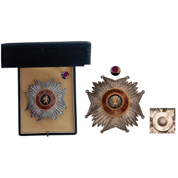 Grand Officer's Breast Star, instituted 1832. Breast Star, 86 mm, Silver, central medalion gilt Silver, maker's "DeGreef, Bruxelles", with two side hooks and wide tapered pin on the back, in original case of issue by "de Greef, Bruxelles" with lapel hole roseete. I