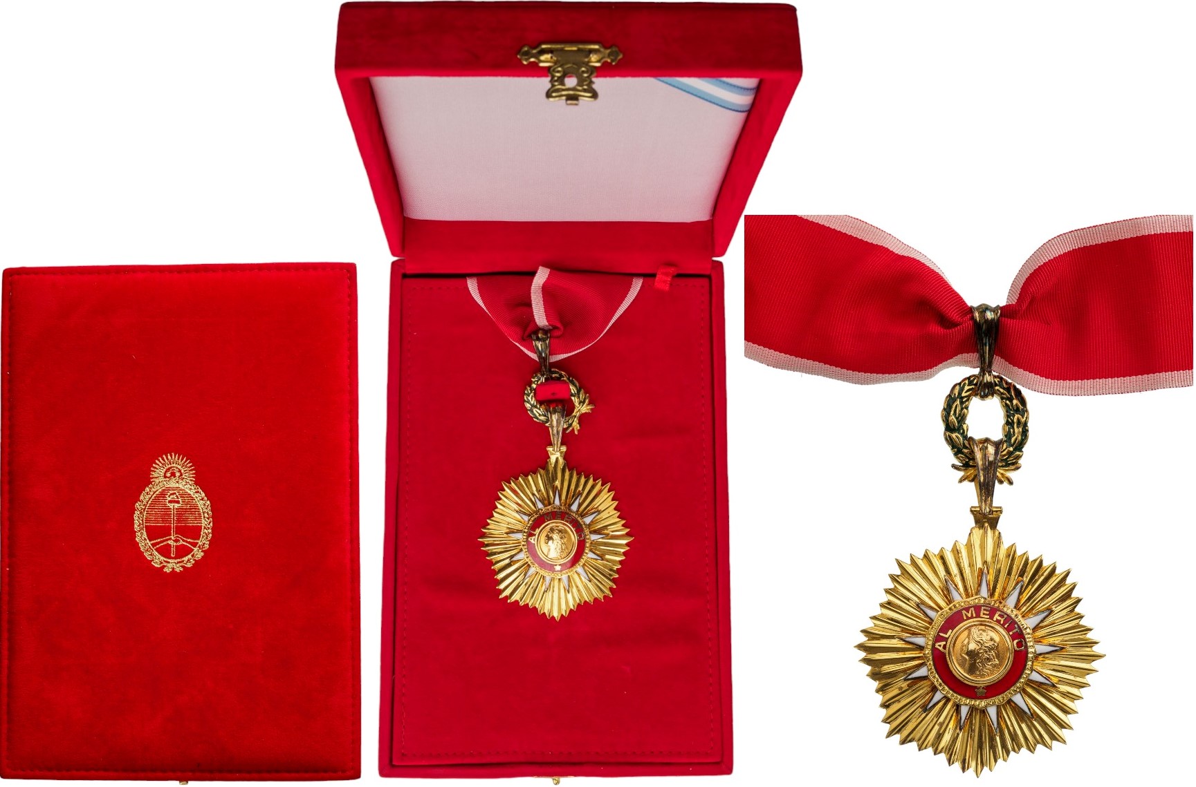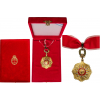 Commander`s Cross, 3rd Class, institued in 1957. Neck Badge, 101x62 mm, gilt Silver, central medallion gilt, enameled, original suspension loop and complete neck ribbon, in original velevt case of issue with gilt coat of arms on the lid. Mint state! I