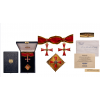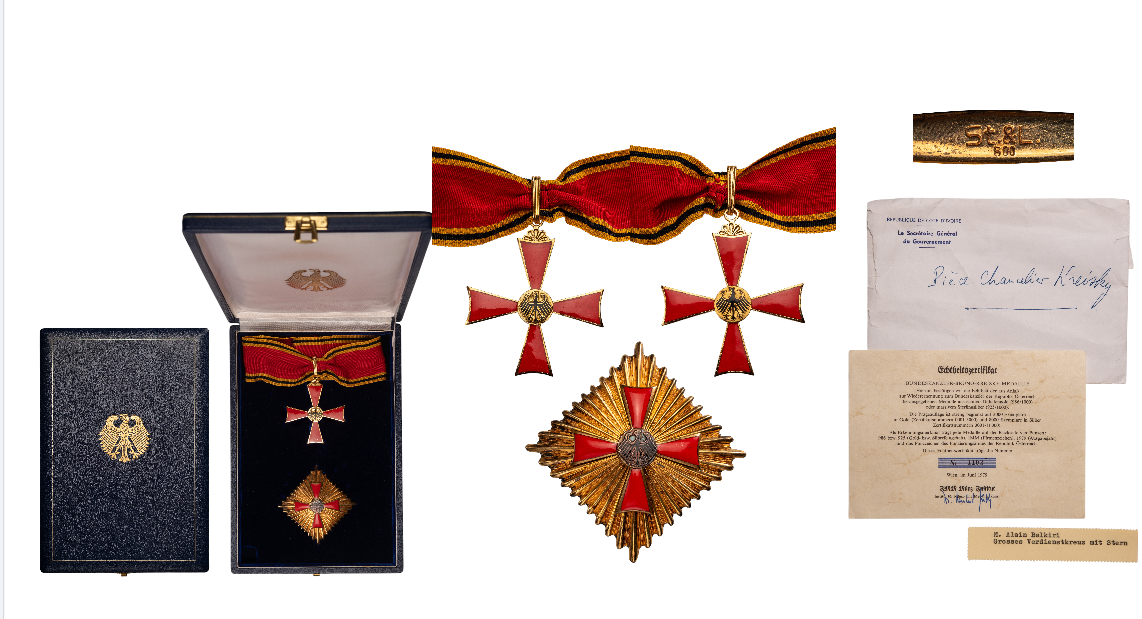 Grand Officer's Set, instituted in 1951. Neck Badge, 70x58 mm, gilt Silver, central medallions gilt silver, enameled, original suspension loop and long ribbon with closing system. Breast Star, 78 mm, gilt Silver, with smooth rays, superimposed part gilt Silver, halmarked "800", maker's mark "St. & L.", enameled, reverse with tapered vertical pin, in original case of issue, with gilt eagle in and on the lid and authenticity certificate. I