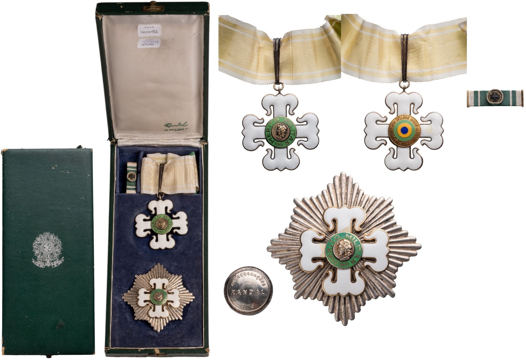 Grand Officer's Set, 2nd Class, instituted in 1934. Neck Badge, 60x55 mm, gilt Silver, enameled, both central medallions gilt silver, enameled, original suspension loop and neck ribbon with lapel hole rosette. Breast Star, Silver, 75 mm, superimposed part gilt silver, enameled, maker's mark "Randal, Rio", reverse with long vertical pin, in case of issue by "Randal, Rio". Extremey fine and scarce set! I R!