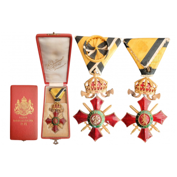 Officer's Cross with Crown, 4th Class, 1st Model, 1900 - 1933, Breast Badge, 75x51 mm, gilt Bronze, central medallion enameled, original suspension ring and ribbon with rosette, in case of issue, with gilt weapon on the lid, by "Johann Schwerdtner, Wien". Extremely fine condition and best quality! I