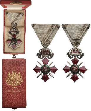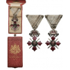 Knight's Cross with crown, 5th Class, 1st Model, 1900 - 1933. Breast Badge, 70x46 mm, Silver, central medallion enameled, original suspension ring and ribbon, in case of issue, with gilt weapon on the lid. Extremely fine condition and best quality! I
