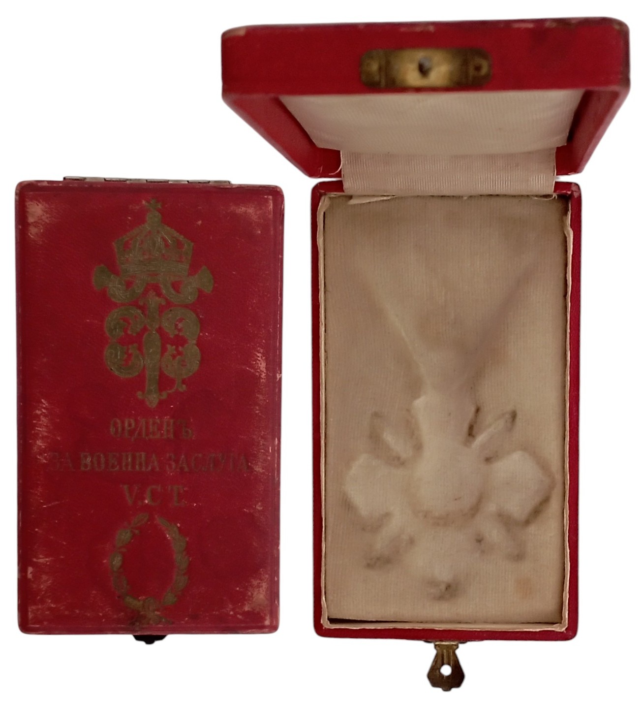 SKU: 190 The Live Auction begins in: Click here to register for the live Auction Starting price 60 EUR Log in to place a bid. Total bids: 0BULGARIAKnight's Cross with Battlefield Distinction, 5th Class. Original Case of Issue, with gilt monogram of Tsar Ferdinind I and inscription on the lid. Very fine condition, scarce! II R! Shop ID: 69,235Auction LXX - Day 1